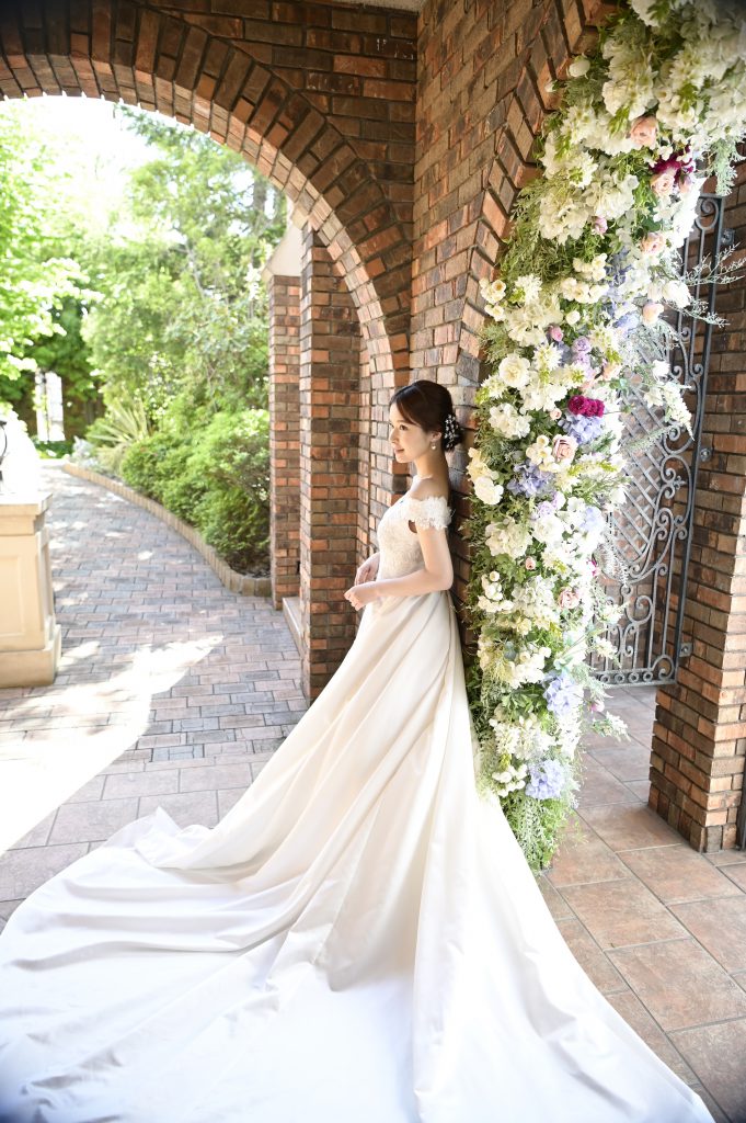 入口にはお花で作られたアーチ、そのまま進んでいただくと緑豊かなガーデン、扉を開ければ本格的ステンドグラスのチャペル。